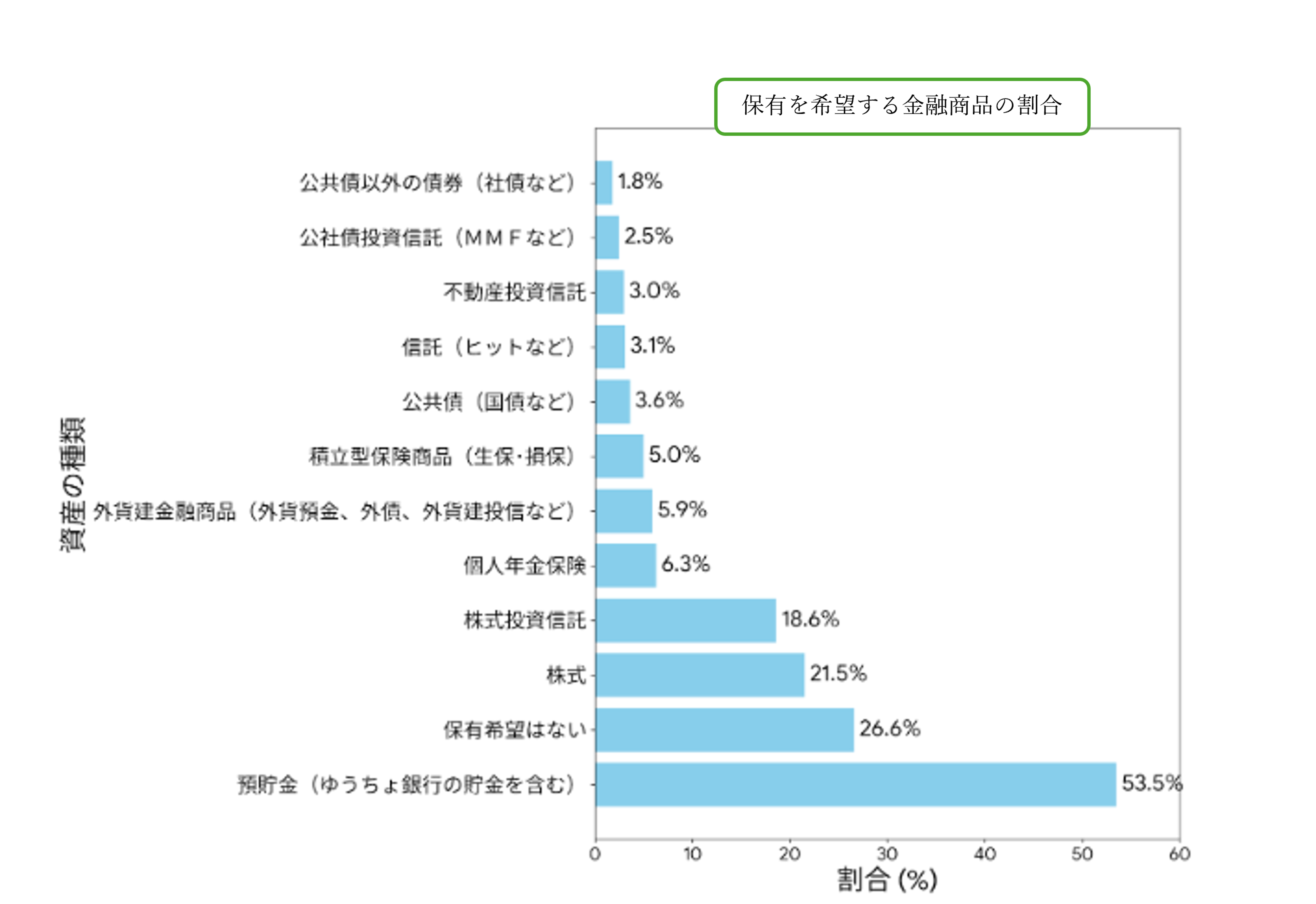 調査回答者の半数以上が「預貯金」を挙げ、次いで「保有希望はない」、「株式」、「株式投資信託」となっており、投資では「株式」と「株式投資信託」への関心が高いようです。