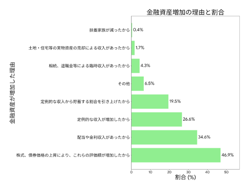 もっとも割合が高いのは、「株式、債券価格の上昇により、これらの評価額が増加したから」、次いで「配当や金利収入があったから」、「定例的な収入が増加したから」となっています。
