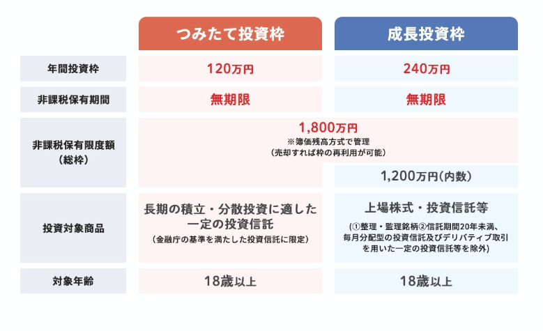 年間投資枠は、「つみたて投資枠」が120万円、「成長投資枠」が240万円で、非課税の保有限度額(総枠)は1,800万円です。