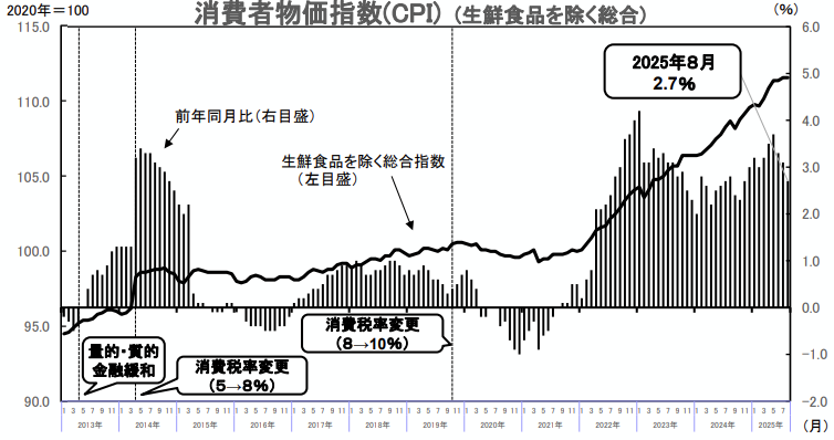 2020年を100とした物価指数は上昇を続け、2025年8月の「生鮮食品を除く総合」の物価は、前年同月比 2.7%でした。