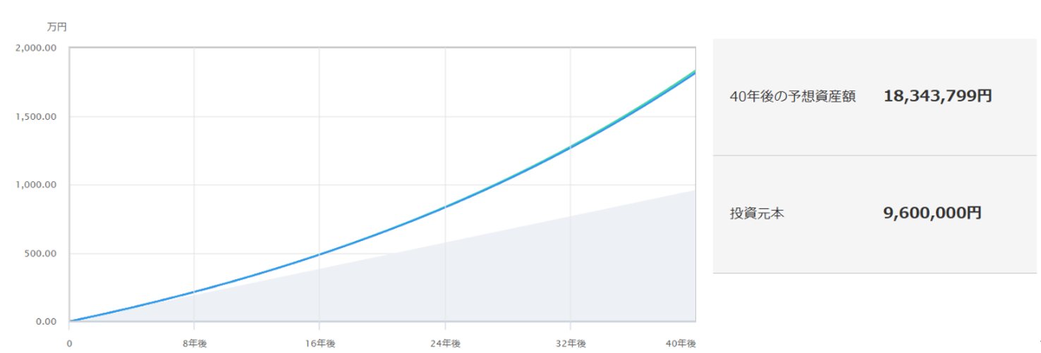 たとえば、想定リターン3%で、毎月2万円ずつ40年間、つみたて投資をすると設定したら、以下のような結果が出ました。