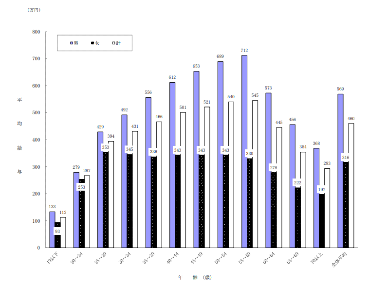 これをみると、平均給与は55-59歳まで、年代が上がるにつれて高くなることがわかります。
