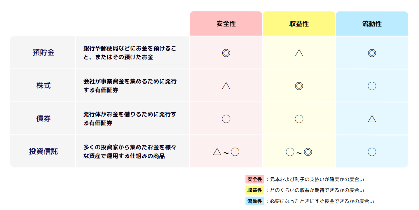 株式、債券など、投資の対象となる資産(金融商品)には、それぞれ以下のような特徴があります。