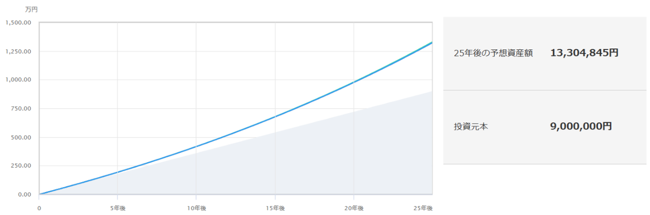 積み立てたお金900万円に対して約430万円の運用益が出て、25年後の予想資産額は約1,330万円になります。