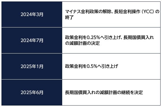 2025年1月は、政策金利を0.25%から0.5%に引き上げ、2025年6月には、長期国債買入れの減額計画の継続が決定されました。原則として2026 年1~3月までは毎四半期4,000 億円程度ずつ、2026 年4~6月以降は毎四半期 2,000 億円程度ずつ減額し、2027 年1~3月には月間の買入れ額を2兆円程度とする予定です。*8