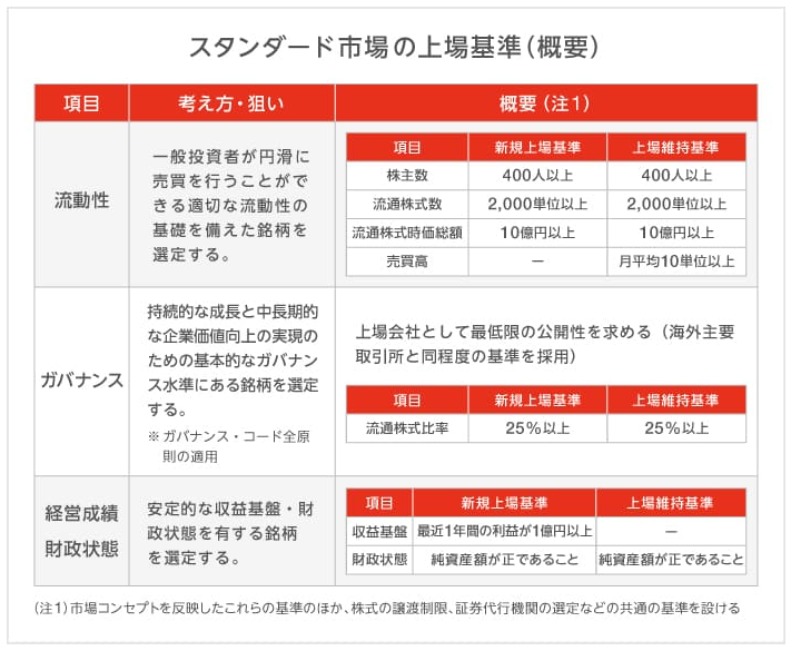 スタンダード市場は、公開された市場における投資対象として一定の時価総額(流動性)を持ち、上場企業としての基本的なガバナンス水準を備えつつ、持続的な成長と中長期的な企業価値の向上にコミットする企業向けの市場です。*8