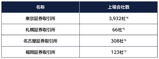 日本には「東京証券取引所」「札幌証券取引所」「名古屋証券取引所」「福岡証券取引所」の4つ証券取引所があります。*2