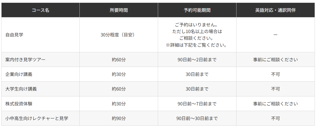 小学生から社会人、さらには企業向け講義、株式投資経験まで、対象や目的に応じたプログラムが組まれており、すべて無料。ふだんはなかなか知ることのできない取引所の仕組みや歴史を学べるのが魅力です。