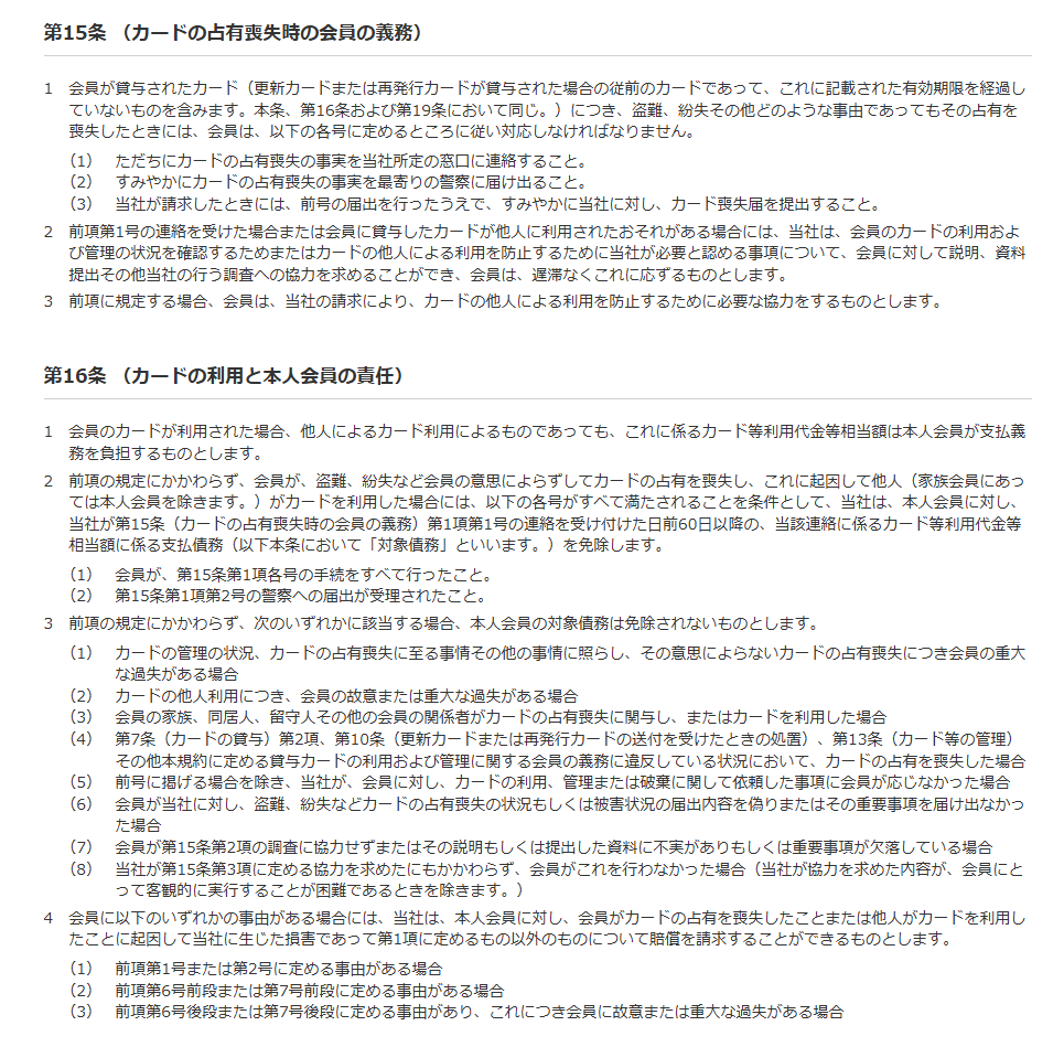 その一方で、会員の意思によらずしてカードの占有を喪失した場合の不正利用については、60日以内にカード会社に連絡することなどを条件として、利用代金の支払義務を免除するものとしています(同条第2項)。