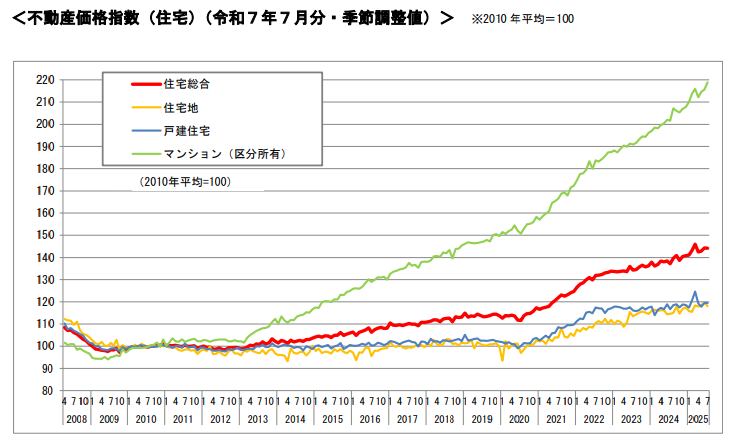 2010年平均を基準(100)とした2025年7月分の季節調整値は、全国の住宅総合が144.2となりました。全国の住宅価格は長期的に上昇傾向が続いています。特にマンション(区分所有)が大きく上昇しており、2010年平均と比較して2倍を超える水準に達しています。*2