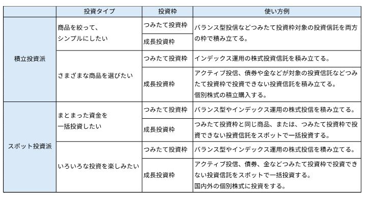以下の表1は、「つみたて投資枠」と「成長投資枠」について、コツコツ積み立てたい「積立慎重派」と、タイミングを見て投資したい「スポット投資派」の2つのタイプ別に、金融商品の選び方をまとめた参考例です。*7