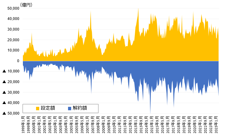 下の図3は、投資信託の月間解約額をマイナス方向(青色部分)に、同じ月の設定額(購入額)をプラス方向(オレンジ色の部分)に示したものです。