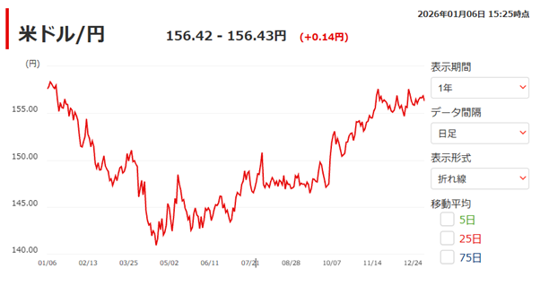 出所)三菱UFJ銀行「外国為替相場チャート表」(期間:2025年1月6日~2026年1月6日)