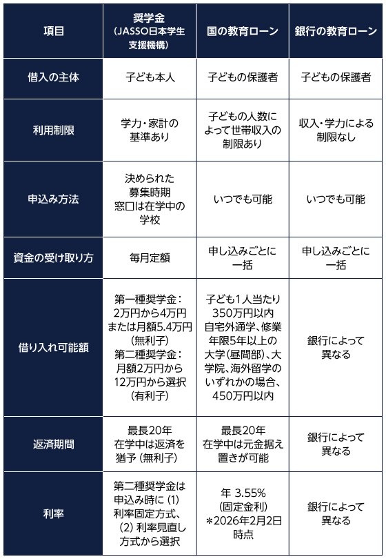 表3 JASSOの奨学金・国の教育ローン・銀行の教育ローンの比較