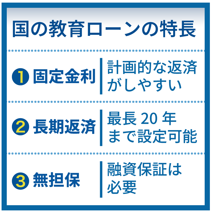 国の教育ローンには下の表2のように、「固定金利」「長期返済」「無担保」という特長があり、利用しやすい設計になっています。