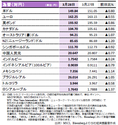 ●米10年国債利回りは大幅低下。景気悪化リスクを意識。金利先物(OIS)の織り込む今年末の米政策金利は3.600%(前日3.690%)へ低下。3月のミシガン大学消費者信頼感指数(確報値)は57.0(速報値57.9)へ下方修正。