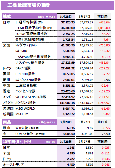 ●日経平均は大幅続落。米政府による自動車関税などを嫌気し東証33業種全てが下落。自動車、海運株が特に軟調。リスク回避の動きから10年国債利回りは低下。