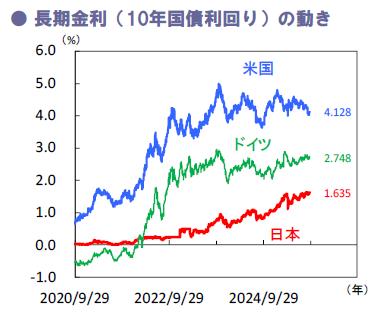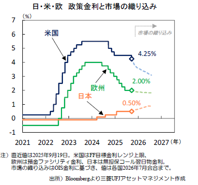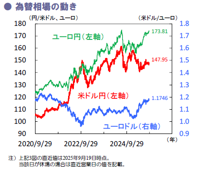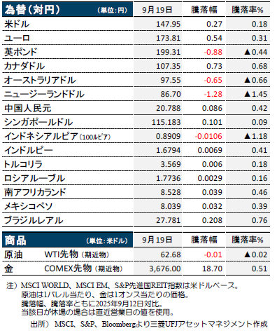 16-17日に9月FOMCが開催され、雇用の下振れリスクを警戒し、6会合ぶりに0.25%ptの利下げを決定しました。本会合での利下げ自体は市場の予想通りであったものの、結果を受け市場では金利上昇が見られ、パウエル米連邦準備理事会(FRB)議長の発言や政策金利見通しで示された利下げペースが、市場の期待ほどハト派的(金融緩和に積極的)でなかった点が意識された模様です。