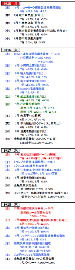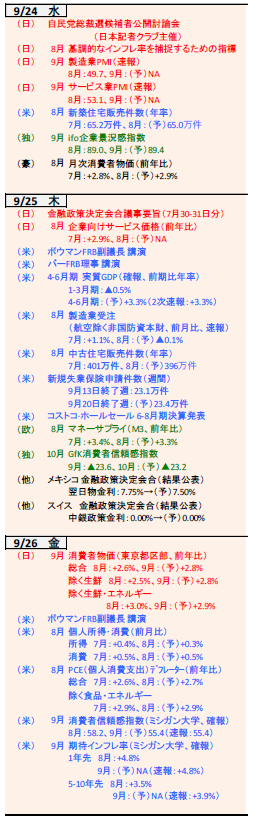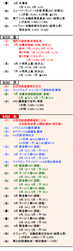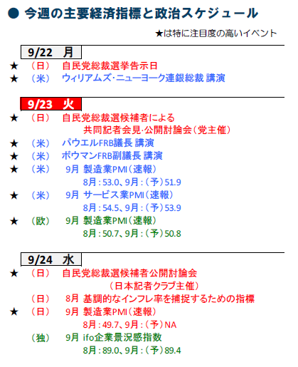 今週は9月FOMC後の米高官発言が注目されます。経済指標では9月購買担当者指数(PMI)が公表、各国の景気拡大基調が維持されるかが焦点です。他方、日本では22日に自民党総裁選告示日を迎え、10月4日の投開票に向け国内政治動向への市場の関心は高まるでしょう。(今井)