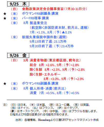 今週は、9月FOMC後の各委員の発言に注目が集まります。政策金利見通しでは、年内利上げを予想する委員が見られた一方、年5回の利下げを予想する委員が見られるなど見方が割れている様子がうかがえ、景気認識や先行きの政策金利の軌道についての発言が注目されます。