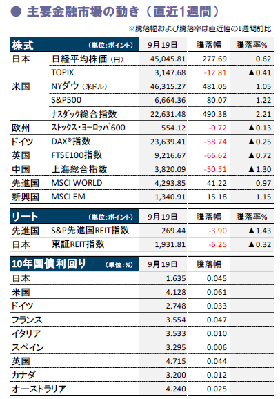 先週の株式市場は、週前半は9月米連邦公開市場委員会(FOMC)を控え神経質な展開が続きました。その後、市場はFOMCの結果を無難に消化、週末にかけ株価は底堅く推移しました。他方、18-19日の日銀金融政策決定会合にて、市場の想定よりも早いタイミングでETF・J-REITの売却が決定され、日本株が下落する場面も見られました。