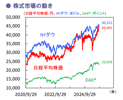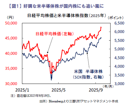 先週の国内株式は、日経平均株価が18日に終値で初の45,000円を突破するなど堅調。米国市場では、半導体のSOX指数が17日にかけ約8年ぶりの9連騰となるなど、AI需要への期待が国内株の追い風となりました(図1)。ただし19日、日銀金融政策決定会合での政策金利据え置きの一方、市場想定より早い上場投資信託(ETF)等の売却決定が嫌気され大幅安となる場面もありました。