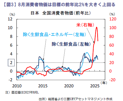 目先の市場では、日銀の年内追加利上げの可能性が意識されそうです。19日公表の8月の全国消費者物価は、除く生鮮食品(コア)が前年比+2.7%と8カ月ぶりに+3%を下回ったものの(図3)、除く生鮮・エネルギー(コアコア)は同+3.3%とインフレ高止まりを示唆しました。