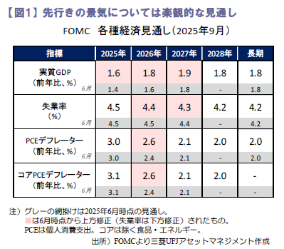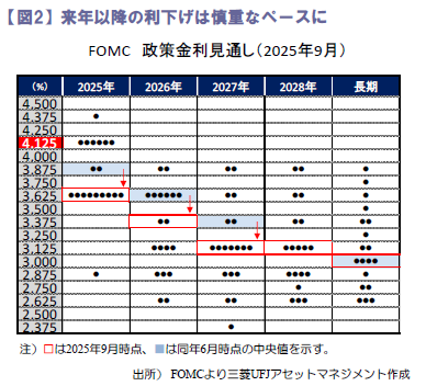 同議長は、今回の利下げは「リスク管理的」なものであるとし、今後の政策判断についても「会合毎に判断する状況にある」と述べるなど、利下げに前のめりな姿勢は示さなかった印象です。また、経済見通しでは、実質GDPは上方修正、失業率は下方修正されるなど景気への楽観的な見方が示されました(図1)。政策金利見通し(ドットチャート)では、年内あと2回の利下げが示唆されるなど、前回より緩和的な姿勢が示された一方、2026・27年に1回ずつ利下げを行う見通しは維持されました(図2)。