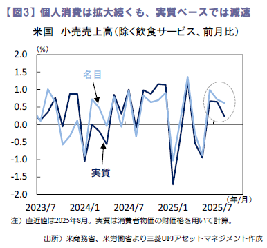 16日公表の8月小売売上高は、前月比+0.6%と市場予想(同+0.2%)を大きく上回り、3カ月連続での増加を示しました。また、GDPの計算に用いられるコア小売売上高(除く自動車・ガソリン・建設資材・飲食サービス)も同+0.7%と堅調でした。内訳では、非店舗小売・衣類・娯楽用品など幅広い項目で増加が見られ、個人消費の健全な拡大が続いていることが示唆されました。ただし、足元で関税による財価格上昇が顕在化し始めていることから、物価上昇を加味した実質ベースではやや弱含んでいます(図3)。消費動向を巡っては今週26日に8月個人消費支出が公表され、サービス消費を含めた個人消費が依然として拡大基調を維持しているかに注目が集まります。