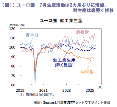 16日に公表されたユーロ圏の7月鉱工業生産は、前月比+0.3%と2カ月ぶりに増加に転じ、5月・6月値は上方修正(図1)。米関税政策等の影響から、外需が弱含む下でも財生産の底堅さを確認する結果となりました。良好な雇用環境や、ドイツをはじめとする域内での防衛増強・インフラ投資への積極姿勢が生産活動を下支えしているとみられ、先行きを見通す上でもその動向が注視されます。