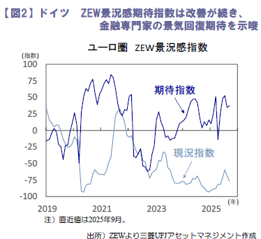 同日に公表されたドイツの9月ZEW景況感指数でも、ドイツの財政拡張策等への強い期待が窺えます。金融専門家の先行き見通しを反映する期待指数は、事前の悪化予想に反して改善し(図2)、長らく低迷を続けてきた同国景気が回復に向かうとの見方は根強い模様です。