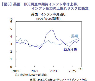 イングランド銀行(英国中銀、BOE)は18日、9月金融政策委員会(MPC)結果および議事要旨を公表し、政策金利を据え置きました。声明文では、段階的かつ慎重に金融引き締めの解除を行うとして、政策運営方針を巡る文言は維持。11月会合での利下げを完全に排除せずも、中期的なインフレ圧力の上振れリスクを改めて指摘し、追加利下げへの慎重姿勢が窺えます。英国の8月消費者物価(17日)は前年比+3.8%と、BOEの8月見通しに沿うも高止まりし、BOE調査の期待インフレ率も上昇(図3)。ディスインフレ圧力が弱まる可能性が意識され、労働市場の軟化は緩慢。年内は見極め姿勢を強め、追加利下げは来年2月会合に先送りされる可能性が高まっています。