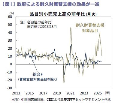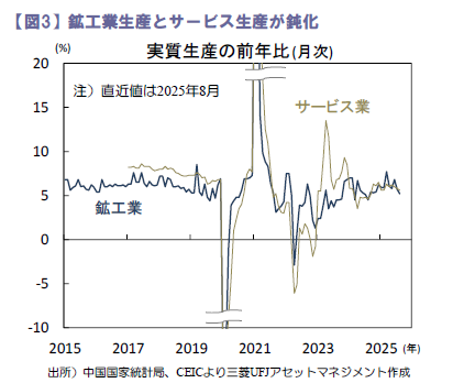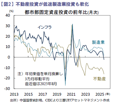 小売売上高(名目)は前年比+3.4%(7月+3.7%)と、昨年9月以来の水準へ低下。これまで消費をけん引してきた耐久財買い替え支援策の効果が薄れています(図1)。家電製品は同+14.3%(同+28.7%)、家具は同+20.6%(同+28.7%)、通信機器は同+7.3%( 同+14.9%) へ鈍化。自動車も同+0.8%(同▲1.5%)へ反発しつつ軟調でした。公務員向け倹約令強化の影響で関連項目が低迷。飲食サービスは同+2.1%(同+1.1%)、飲料が同+2.8%(同+2.7%)と加速しつつも軟調で、酒・タバコは同▲2.3%(同+2.7%)へ反落しました。都市部固定資産投資(名目、単月換算)は同▲6.3%(同▲5.2%)へ下げ幅を拡大。2カ月連続の落ち込みはコロナ感染が拡大した2021年以来です。製造業投資は同▲1.3%(同▲0.3%)へ悪化。政府による産業高度化支援の対象分野やAI関連の投資が堅調であった一方、過当競争(「内巻」)部門で過剰設備削減に向けた動きが進み、米関税を巡る不透明感から輸出部門の投資も低迷しました。