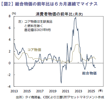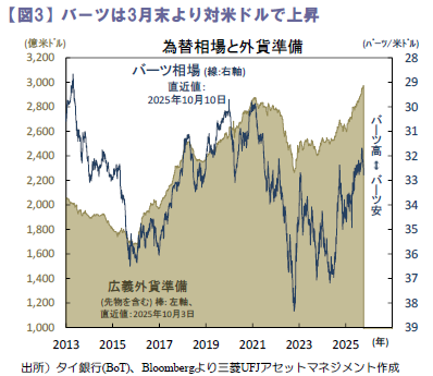 今回は10月に就任したウィタイ・ラタナコン新総裁にとって初の政策会合。同総裁は前任のセタプット総裁に比べてハト派とみられており、市場参加者は連続利下げを予想しました。しかし、新総裁以外の金融政策委員の多くが早期の利下げに慎重であった模様。政策声明のトーンも前回までのものに近く、総裁の交代に伴う変化は今のところみられません。声明は、景気は今年後半から来年にかけて鈍化するだろうとし、GDP成長率予想を下方修正(2025年+2.3%→+2.2%、2026年+1.7%→1.6%)。また、総合消費者物価上昇率(図2)の予想も下方修正しました(2025年+0.5%→0.0%、2026年+0.8%→+0.5%)。今のところデフレのリスクは低いとしつつも、今後も物価動向を注視しデフレ・リスクを見極めると記述。長引くデフレが期待インフレ率を押し下げる可能性を警戒している模様です。また、通貨バーツが対米ドルで上昇しており(図3)、輸出に影響を与えているとも指摘。経済への影響があるため今後もバーツ相場動向を注視すると、前回とほぼ同じ文言でバーツ高への警戒感を表明しました。