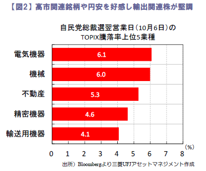 他方、高市氏は政策金利の引き上げには慎重姿勢を示していることから、日銀の年内追加利上げ観測が後退、為替市場では、財政拡張懸念も加わり円売りが加速し、ドル円は一時1米ドル153円台と8カ月ぶりの安値を付けました。円安を好感し、電機や機械、精密機器、輸送用機器など輸出関連株が堅調。また防衛や核融合、宇宙など高市氏が掲げる政策に関連した銘柄や日銀の利上げが緩やかになるとの観測から不動産も堅調でした(図2)。