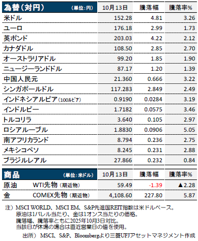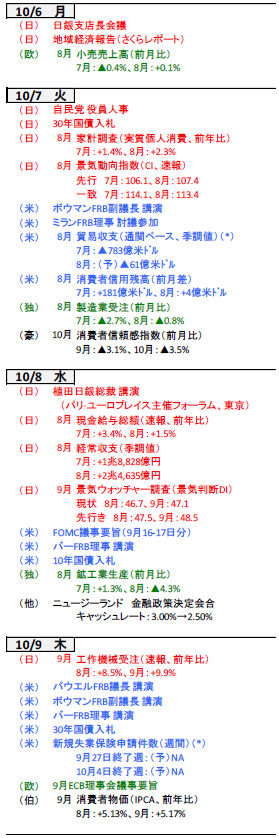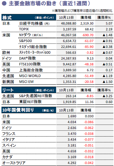 先週は、自民党総裁選での高市氏勝利を受け、同氏が掲げる緩和的な金融・財政政策への期待から、日本株上昇・国内金利上昇・円安が目立ちました。米国では、政府機関閉鎖で経済指標の公表が滞り手掛かりに欠く展開が続くも、10日に米政権が100%の対中追加関税(11月1日~)を公表、米中対立への懸念から米国株は下落しました。