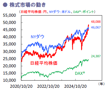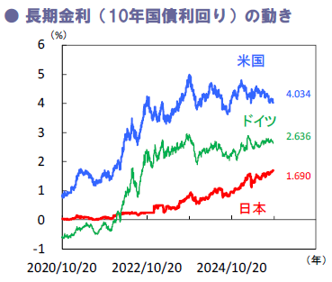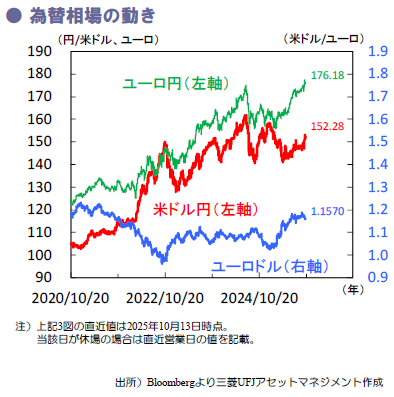 先週は為替市場で急速に円安が進み、米ドル円は2024年に為替介入が実施された水準に近づく動きが見られました(上図)。10日には円高に振れるも、自公連立解消や首班指名など政局を巡る不透明感に加え根強い財政拡張懸念などから、円安圧力が続く可能性には要注意です。他方、米中対立を巡っては、米政権が対中追加関税公表後に対立姿勢を軟化させるなど、今後譲歩が見られる可能性もあり、冷静に情勢を見極める必要があるでしょう。