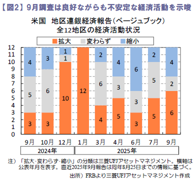 15日に地区連銀経済報告(ベージュブック)が公表されます。足元で複数の経済指標の公表が見送られる中、経済・雇用・物価など、包括的に米景気の動向を捉えることができる情報として市場の関心は高いとみられます。前回9月報告では、経済活動が「拡大」と回答した地区が増えた一方「縮小」と回答した地区も増え、堅調ながらも不安定な経済環境であることが示唆されました(図2)。10月報告では、経済や雇用に急速な悪化が見られていないかに加え、関税コストの価格転嫁の動向や企業がインフレ長期化への懸念を強めていないかが注目されます。