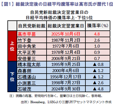先週の国内株式は、積極財政を掲げる高市氏が自民党総裁に就いたことを受け大幅上昇。6日の日経平均株価は、前日比2,176円高(+4.8%)となり、1日の上げ幅としては、同指数算出開始以降4番目の大きさとなりました。また、日経平均株価でみた総裁決定翌営業日の騰落率は、歴代の自民党総裁のうち高市氏がトップとなり(図1)、同氏の政策に対する市場の期待がうかがえます。