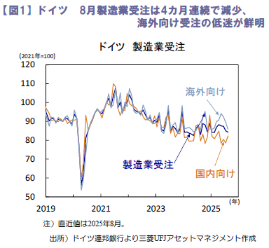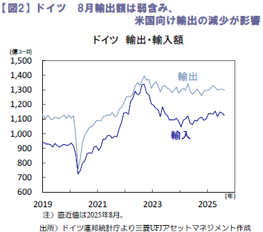 7日に公表されたドイツの8月製造業受注は、前月比▲0.8%と事前の増加予想(同+1.1%)に反して、4カ月連続で減少しました(図1)。とりわけ、海外からの受注減(同▲4.1%)が際立ち、外需の弱さを反映。9日に公表された同国の8月輸出も同▲0.5%と弱含み、外需低迷を裏付ける結果となりました(図2)。地域別では米国向けの減少が鮮明。米国による高関税賦課に、ユーロ高の影響も加わり、米国向け輸出の早期回復は期待し難い状況です。