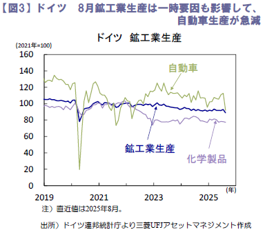 また、産業別では自動車受注が同▲6.4%と大きく減少。夏季休暇に伴う工場閉鎖等が影響した他、新モデル公表を控えていることも受注減につながった模様です。ドイツの鉱工業生産(8日)も同▲4.3%と事前予想を超える落ち込みとなり(図3)、自動車生産は同▲18.5%と急減。一時的な要因による影響もあるものの、生産活動の弱さを受け、同国景気が7‐9月期にマイナス成長に陥る可能性が意識されます。一方、国内受注は同+4.7%と増加。武器・弾薬(同+364%)やその他輸送機器(同+17%)の受注は急増し、政府による防衛費増加の恩恵が確認されます。しかし、ドイツ政府の発表したインフラ投資拡大等に伴う新規受注増は未だ現出せず、生産回復が遅れ、年末にかけて景気低迷が続くとの懸念は再び高まっています。