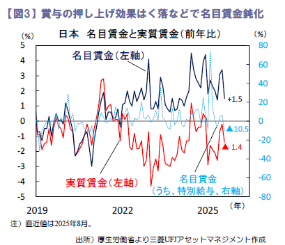 8日公表の8月の毎月勤労統計は、実質賃金が前年比▲1.4%と8カ月連続でマイナスとなり、市場予想の同▲0.5%を下回りました。背景には、賞与などの特別に支払われた給与が前年比▲10.5%と大幅下落し、名目賃金の伸びが鈍化したことが考えられます(図3)。また、依然として物価高が続いていることも、実質賃金を押し下げており、新政権による物価高対策が急務な状況です。