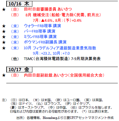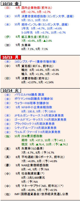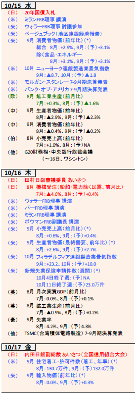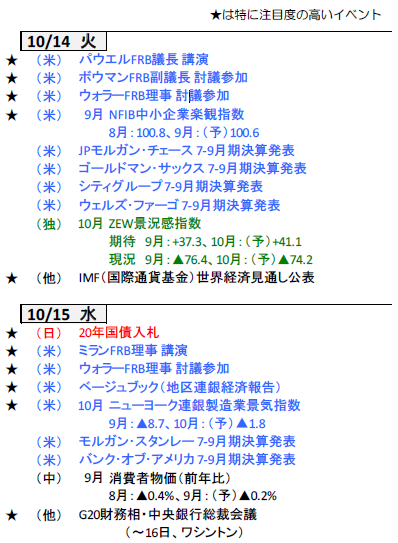 今週は国内政治に加え、米中当局の動向や本格化する米企業決算が注目されます。米議会の動きも注視され、政府機関閉鎖が長引けば、景気を下押しする可能性が意識されやすいとみています。また、米経済指標の公表が滞る中では、米景気の方向性を探るべく地区連銀経済報告(ベージュブック)の注目は高まるでしょう。(今井)