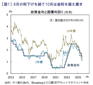 景気が鈍化しデフレが長引くタイで、当局は市場の利下げ予想を裏切って政策金利を維持。もっとも、今回の金利据え置きは利下げサイクルの終わりでなく一時休止とみられます。当局は景気物価動向を注視しつつ、今年末から来春にかけてあと2回金利を引き下げるでしょう。