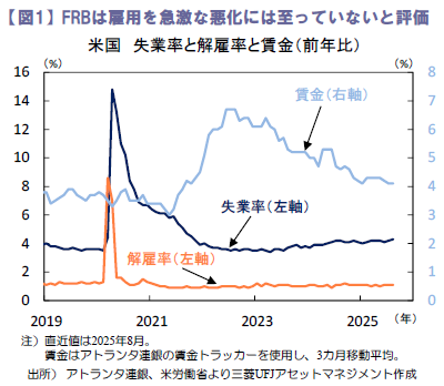 8日公表の9月米連邦公開市場委員会(FOMC)議事要旨では、多くの委員が年内の追加利下げに前向きな姿勢を示した一方で、インフレ見通しに対する上振れリスクを重視する委員も半数以上を占めていたと言及され、委員の間で見方が分かれていることが示唆されました。他方、雇用については、雇用者増加ペースの鈍化が確認され、先行きの下振れリスクは高まっているものの、複数の指標を鑑みると労働市場の急激な悪化までは示していないと言及されました(図1)。今週もパウエル米連邦準備理事会(FRB)議長を含む高官発言が予定されており、雇用・物価に加え政策金利の軌道を巡る発言が注目されます。