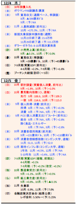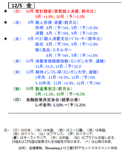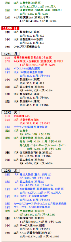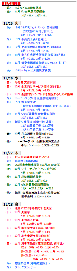 今月の焦点は米FOMC(9-10日)と日銀会合(18-19日)。今週は両国の今後の政策金利軌道を占うための材料を探す週となるでしょう。米国は発言自粛期間に入りパウエルFRB議長らは金融政策に言及しない見込み。11月のISM景気指数(1日製造業、3日サービス業)やADP雇用統計(3日)、9月のPCEデフレーター(5日)等が注目されます。日本は1日の植田日銀総裁による講演が焦点。5日には家計調査(10月)も公表されます。欧州は2日にユーロ圏消費者物価(11月)、5日にドイツの製造業受注(10月)を公表。インドは5日に3会合ぶりに利下げを再開するでしょう。(入村)