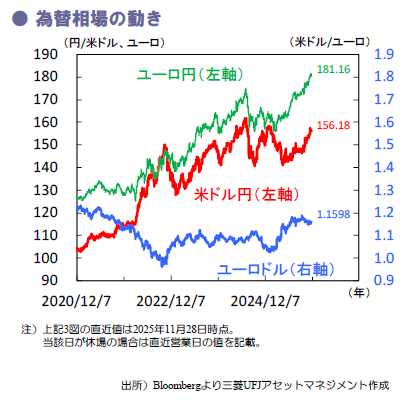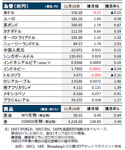 金利先物が織り込む12月FOMCでの利下げ確率は83.0%と(先週28日時点)、11月19日の29.3%より上昇。先々週21日のウィリアムズNY連銀総裁や先週24日のウォラーFRB理事による利下げに前向きな発言が、12月の利下げを市場に織り込ませる動きと解釈された模様です。12月の日銀による利上げ確率も58.1%と、11月21日の16.4%より上昇。複数の日銀審議委員が相次いで利上げに前向きな発言をする中で、急速な円安下で政府の利上げへの抵抗感が低下との観測も浮上しました。先週26日には日銀名古屋支店が東海3県の景気が緩やかに回復との見通しを公表。「米関税の(自動車など)輸出産業への影響は限定的」(利上げの障害にならず)との解釈も生まれた模様です。