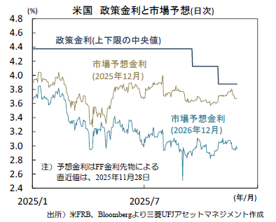 金融政策面で言えば、来週9‐10日にはFOMCが開催され、現在の市場見通し通りの追加利下げ実施となれば、政策金利を巡る不透明感は一旦遠のくことが期待されます。一方のAI関連銘柄への過大評価への懸念は、容易に払拭することは困難とみられます。このため、市場は引き続きこの懸念からの市場変動は避けがたいでしょう。