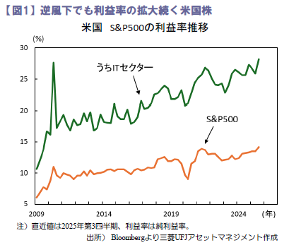 一部銘柄への根強い収益懸念はあるものの、米企業を総じて見れば、収益懸念が広範に及び、株式市場を強く下押しする可能性は高くはないと推察されます。図1に示す米国株の利益率の推移からは、利益率の拡大継続が確認できます。トランプ関税の導入といった逆風下でも、企業の利益を生み出す力は損なわれていません。底堅い収益環境は引き続き相場の支えになると見込まれます。