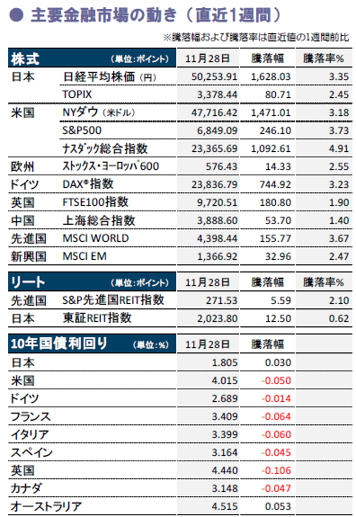 先週の国内株式は、12月米連邦公開市場委員会の利下げ期待の高まりによる米株高を好感し堅調でした。足元軟調だったソフトバンクグループなどAI関連株に見直し買いが入り、11月27日の日経平均株価は7営業日ぶりに節目の5万円台を回復。米利下げ観測の再燃やAIを巡る不透明感の後退により投資家心理は改善傾向にあります。